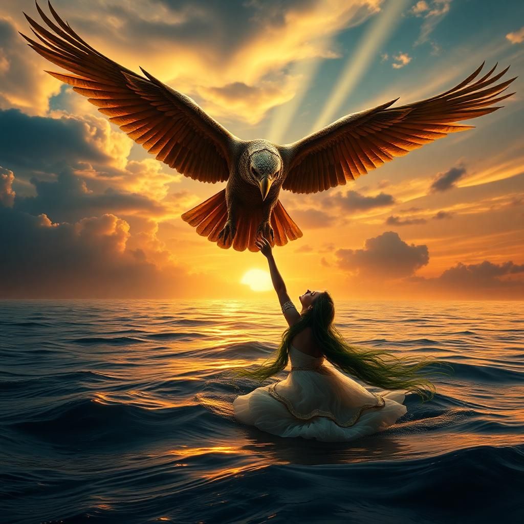 a resplendent eagle-seigneur soars on gilded wings, his eyes burning with fiery intent above the velvety horizon of a setting sun-drenched ocean. his claws grasp for arianna, who floats serene amidst the swirling waters as illuminated tendrils of kelp dance around her raven hair. the woman's emerald tresses wave like water hyacinths, her eyes flashing as she reaches for the outstretched eagle-man's hand. movement and emotion blend as fate's balance teeters, the choice between sinking to the depths or rising on eagle's wings hanging precariously. as sunset's golden light glows feathery across the waves, an array of oranges, whites and soft blues sweep across the tropical-blue expanse above, as fiery spirit beams burst with explosive splendor. hyper-realistic textures sear, painted with fiery, lavish brushstrokes, then swooping swells of vivid blue and inhuman crimson lightings are now depicted vibrant across the mysterious legend skies, filling this fantasy.A cinematic and dramatic fantasy scene where a majestic eagle-headed man with golden wings and intricate jewelry (as shown in the reference image) soars above a vast ocean at twilight. He extends his strong, clawed hand toward a beautiful green-haired woman (from the reference image) who is floating in the water, her long hair flowing like seaweed. She reaches up toward him, their fingertips almost touching, symbolizing the choice between sinking into the depths or rising into the sky. The water reflects the golden light from the setting sun, blending warm and cool tones. Above them, the sky shifts from deep blues to fiery oranges, with swirling clouds and ethereal beams of light illuminating the moment. The image should capture movement, emotion, and an epic sense of destiny, as if this is a moment frozen in a grand mythical story. The eagle-man’s wings are fully extended, feathers catching the light, while the woman’s dress ripples in the water. A cinematic, fantasy-art style with hyper-realistic textures and lightingA cinematic and dramatic fantasy scene where a majestic eagle-headed man with golden wings and intricate jewelry (as shown in the reference image) soars above a vast ocean at twilight. He extends his strong, clawed hand toward a beautiful green-haired woman (from the reference image) who is floating in the water, her long hair flowing like seaweed. She reaches up toward him, their fingertips almost touching, symbolizing the choice between sinking into the depths or rising into the sky. The water reflects the golden light from the setting sun, blending warm and cool tones. Above them, the sky shifts from deep blues to fiery oranges, with swirling clouds and ethereal beams of light illuminating the moment. The image should capture movement, emotion, and an epic sense of destiny, as if this is a moment frozen in a grand mythical story. The eagle-man’s wings are fully extended, feathers catching the light, while the woman’s dress ripples in the water. A cinematic, fantasy-art style with hyper-realistic textures and lighting